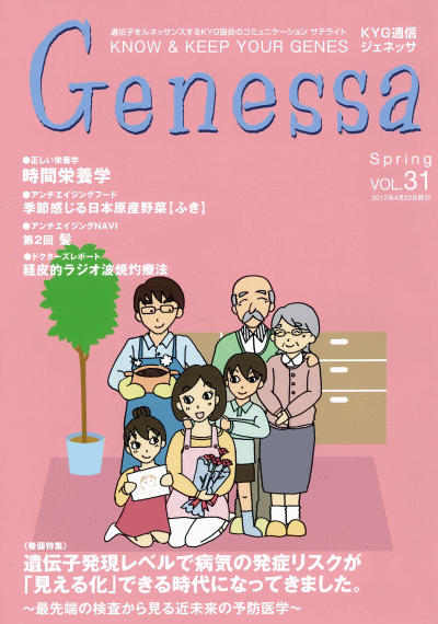 ジェネッサ31号 2012年4月20日発行 定価330円 遺伝子発現レベルで病気の発症リスクが 「見える化」できる時代になってきました。 巻頭特集 遺伝子発現レベルで病気の発症リスクが「見える化」できる時代になってきました。〜最先端の検査から見る近未来の予防医学〜/アンチエイジングNAVI 第2回 髪/アンチエイジングフード 季節感じる日本原産野菜「ふき」/正しい栄養学 時間栄養学/ドクターズレポート シリーズ先端医療はここまで来ている 〜その8 ピンポイントでがん組織を狙い撃ち 経皮的ラジオ波焼灼療法〜 |