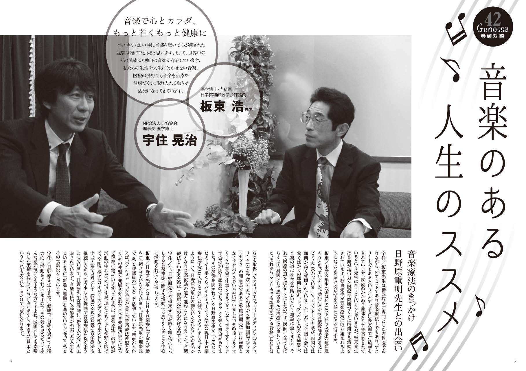 ジェネッサ42号 2015年1月10日発行 定価330円 巻頭対談 宇住晃治×板東浩先生 音楽のある人生のススメ 巻頭対談 宇住晃治×板東浩先生 音楽のある人生のススメ/アンチエイジングNAVI 第13回 総論/アンチエイジングフード vol.39 栄養満点野菜「ブロッコリー」/正しい栄養学 vol.40 鍋料理の栄養学/健康づくりの未来思考 最終回 |